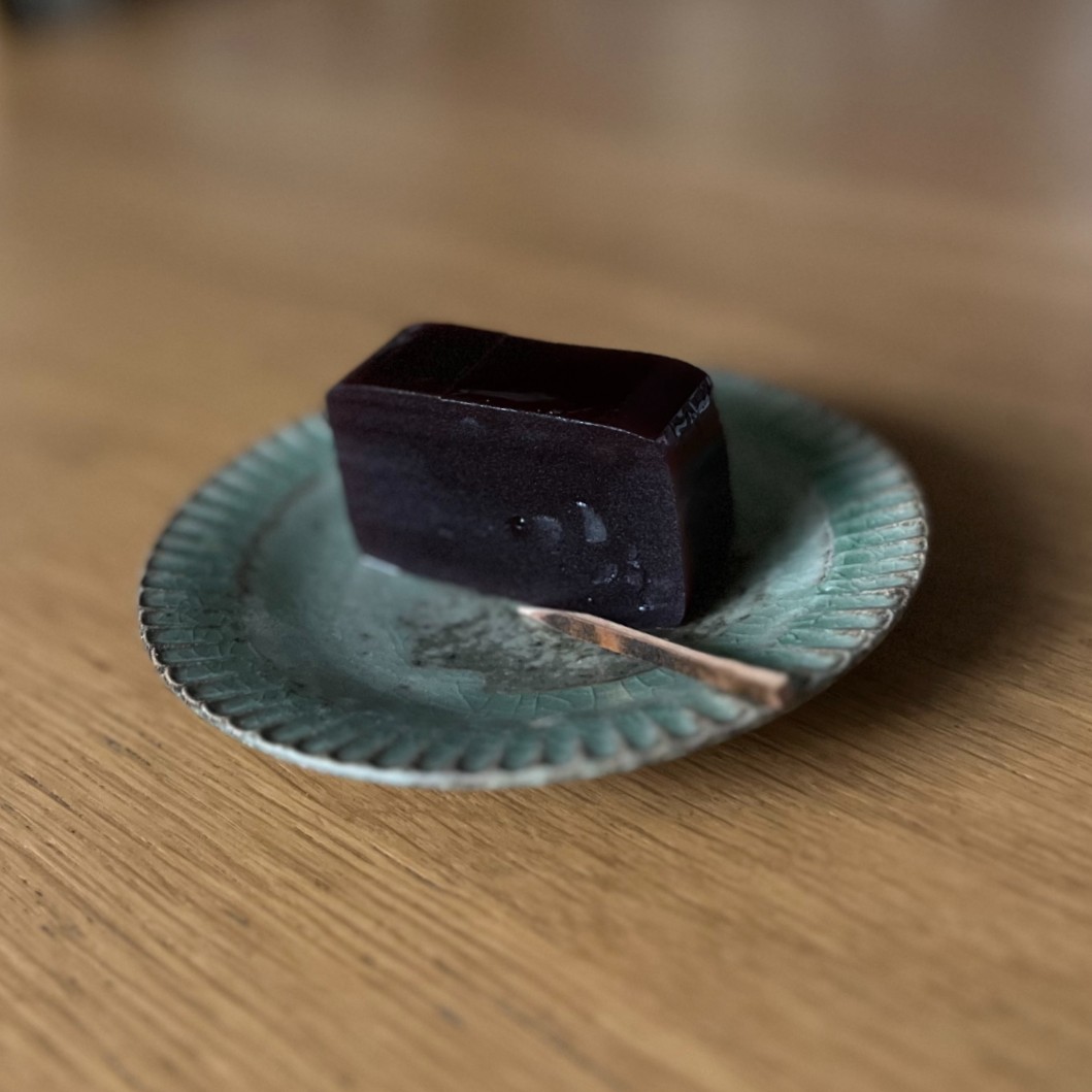 市野さんの灰釉の器は温かみがあります。光の当たり具合で緑やグレー、茶色などが絶妙に混ざり合い、見るたびに違う表情を見せてくれるのが魅力です。リムに施された縞模様が、盛り付けたお料理をきゅっと引き締めてくれます。この4寸縞皿は副菜はもちろん、和菓子をのせるのにもちょうどいいサイズ感。ご褒美おやつのとらやの羊羹がよく似合います。実は灰釉の器は残念ながら在庫限りで終了で、この風合いを楽しめるのは今だけ。気になっていた方はぜひお早めにお迎えしてくださいね。