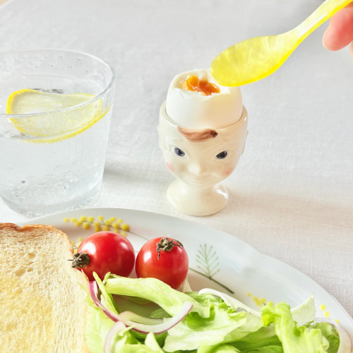 ちょっと個性的で、どことなくアンニュイな雰囲気をまとったエッグカップ。まるでフランスの蚤の市で見つけたような、少しくすんだ色合いとチャーミングな表情が魅力です。ピンクのほっぺと控えめな笑顔を見ていると、忙しい朝にもふっと力が抜けるよう。半熟卵をのせて、スプーンでそっと割る瞬間も楽しくなります。ビタミンカラーのハイムゾーネエッグスプーンイエローと合わせれば、朝の食卓から元気がもらえる気がします。野菜のディップソースやハーブ、ジャムなどを入れても楽しめますよ。