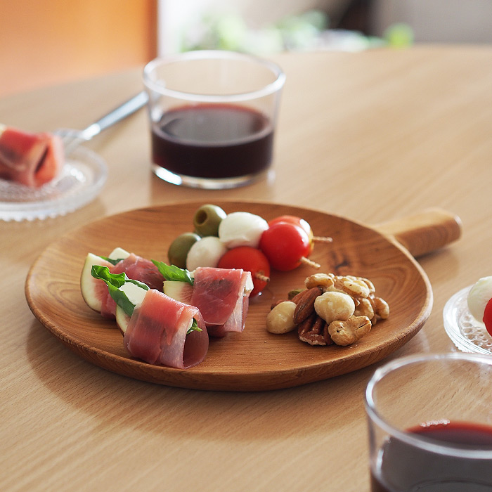 ある日の昼間のちょい飲みプレート。家にあるもので作ったおつまみをチャチャチャっと並べるだけで、あっという間にテーブルが華やぎました。このラケット型のチーク材プレートは、そんな楽しいひとときを格上げしてくれます。持ち手付きのデザインは見た目がお洒落なだけでなく、キッチンからリビングへの移動もスムーズで、持ち運びやすさも抜群。チーク材は耐久性が高く、使い込むほどに色が深まり、美しい風合いへと変化していきます。使えば使うほど愛着が湧き、育てる楽しみも感じられる一枚です。