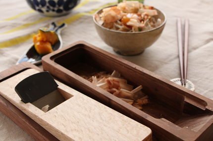 箱の部分は無垢材を丁寧に削り込み、継ぎ目がなくツルリとしています。引き出し式のような高さが出ないため、とてもコンパクトに収納できるし、鰹節を削りたいときにすぐ手にできるフレキシブルさも魅力です。今まで「鰹節を家で削る」ということに馴染みが薄かった方も、「自分で鰹節を削ってみたい!」と思える商品です。丁寧に削った新鮮な鰹節は、出汁をとったり、ごはんにかけたり、野菜を和えたり。食に高いこだわりをもつ方にもご満足いただけるはず。気の利いたギフトとしてもおすすめです。