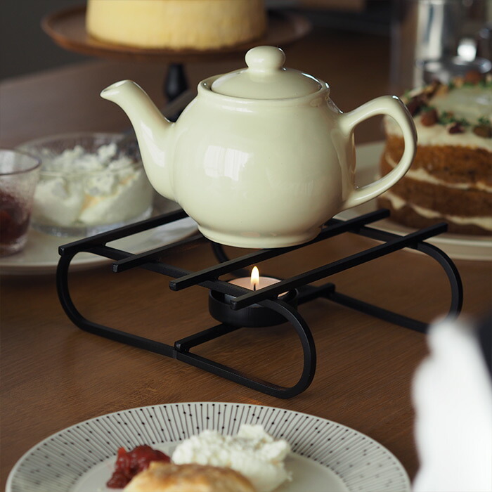 サイズが大きめのため、ティーポットだけでなく、アヒージョを作るスキレットやチーズフォンデュなどの容器を乗せたりにも使えます。こちらも同じようにティーキャンドルが必要。