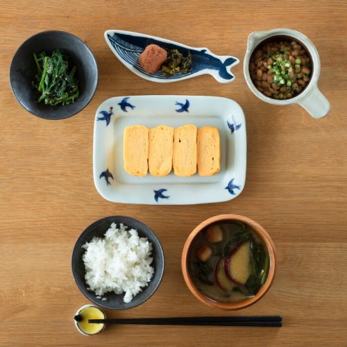 おかずを盛り付けてもワンプレートとして使っても絵になる色絵つばめ 正方角丸プレートと、思わず玉子焼きを並べたくなる色絵つばめ 長方角丸プレートの2種類。四角い器って結構使い勝手が良いのです。