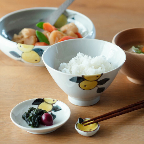 大人気の「色絵みかんシリーズ」から、今回は色絵みかん 飯碗三角 大と、飯碗と一緒に使ってほしい色絵みかん  3寸皿を新たに取り扱わせていただくことになりました。