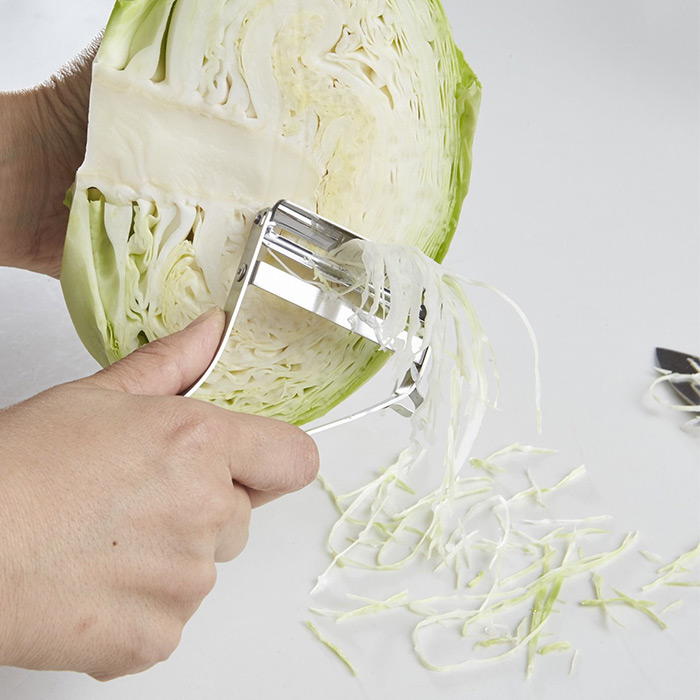 少しワイドな刃幅で、キャベツの千切りもスイスイ。しかも切れ味が抜群だから、スライサーで作ったような“ふわっふわ”の仕上がりに。握りやすい安定感も魅力です。替刃もあり、実は一緒に購入される方が多数。さらにミニサイズやスマホサイズのおろし器も大人気です。