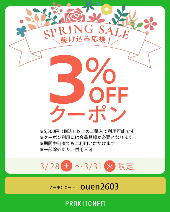 今、迷っている方の背中を後押しするために、プロキッチンでは『お買い物応援3%OFFクーポン』をご用意しました。
