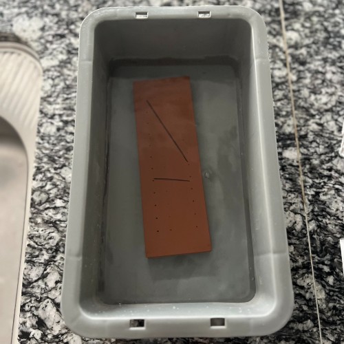 砥石にガイドラインをひいたら、砥石から気泡が出切るまで、約30分ほど水につけておきます。砥石を水に浸すためのボウルを探す手間はありません。専用ケースがそのまま水受けになるので、シンク横で省スペースに準備できます。この水受けの上に研ぎ台を置きます。