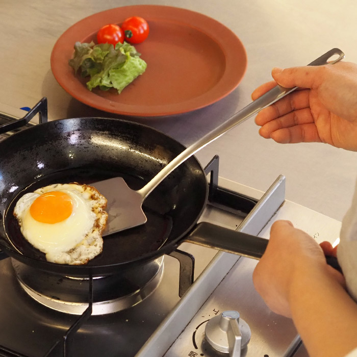 個性的な長方形のカタチの先端部分に注目してください。返し部分の先端、3辺を薄くプレスし、両端には丸みをつけています。そのため、フライパンと料理の間にスーッと入り込み、3方向から料理をすくうことが可能に。ハンドルの絶妙な角度もしっかり計算されているから、目玉焼きやホットケーキを返す作業も流れよく行うことができます。調理中に不安になることのない頼もしい強度が備わっているのも使いやすさのポイント。お好み焼きを切り分ける、そんなときも快適です。