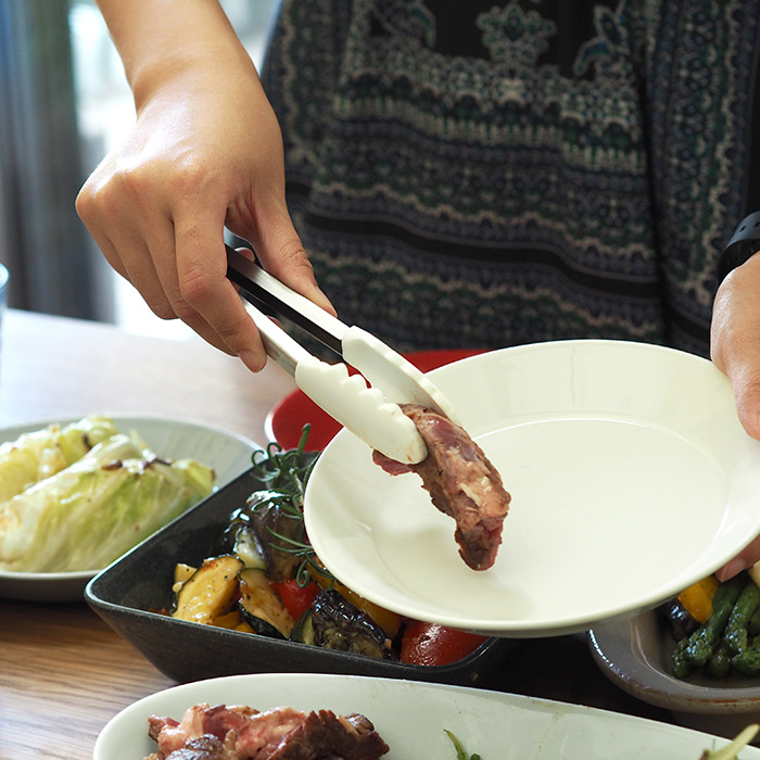 先端部分にしなりを設けた弾力性のあるヘッドは柔らかい食材をつかんでも崩さずきれいにつかめます。またサイドに波型を施すことで、食材を落とすことなくしっかりキャッチ!トングの開き具合やバネの弾力もちょうど良くストレスを感じることがありません。