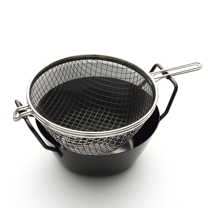 | 材質 | 本体:鉄ブルーテンパー(シリコン塗装)、 ハンドル:鉄(焼付塗装)、 揚げ網・油ハネ防止メッシュ:18-8ステンレス鋼 |