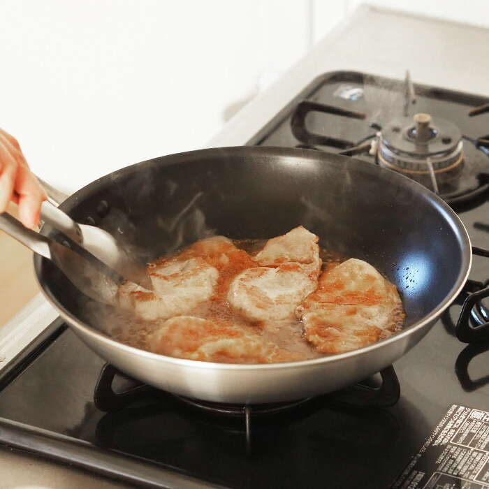 アルミは酸に弱い性質を持っていますが、加工が施されたシルクフライパンならためらうことなくお好きな調理にお使いいいただけます。また、少量の油でも焦げ付かないからヘルシー料理も大得意です。