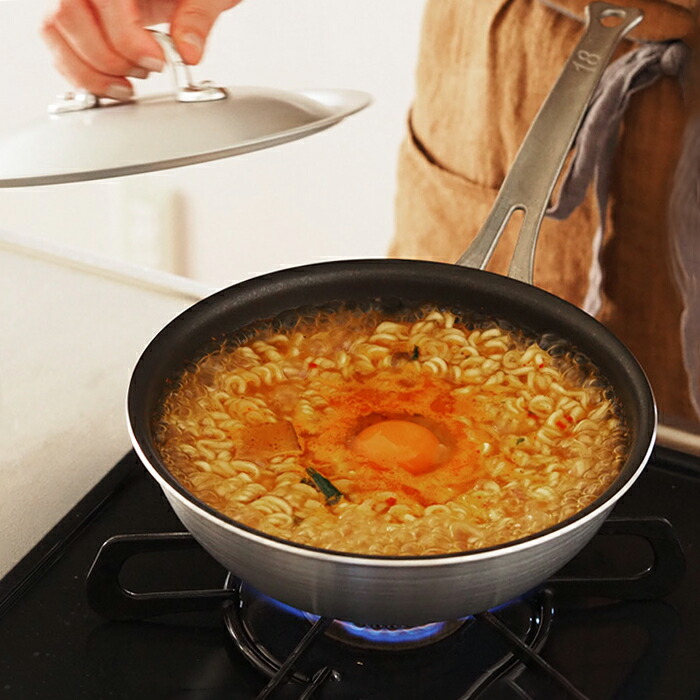 シルクフライパン・深型18cmは副菜作り、お弁当のおかず作り、そして一人分のインスタントラーメンを作るのにちょうど良いサイズ感です。ラーメンにたまごを落としたら別売りのフタを使用してしばしの蒸らしタイム。半熟とろっとろのたまごと一緒にお召し上がりください。また、シルクフライパンは深型と浅型の2タイプ、別売りの専用の蓋がございますので、よく作る料理やお好みに合わせてお選びいただけます。