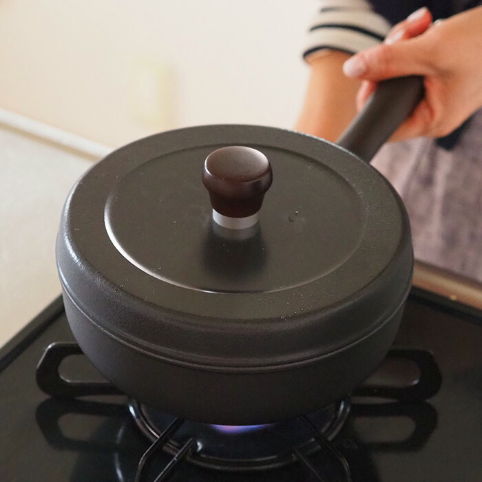 細身で手に馴染む天然木のハンドルが付いた片手鍋18cm。副菜のかぼちゃの煮物やきんぴらごぼう、お弁当づくり、炊飯なら2合まで調理することができる何かと使いやすいサイズです。使用時の注意点は金属製のツールを使わないことと、加工が痛まないよう中火以下の火加減で調理すること。無水鍋というと両手鍋が一般的なので、片手の無水鍋って何気にレア。キャンプなどのアウトドアにもどうぞ。