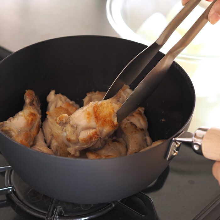 20cmの片手鍋は雪平鍋のような深型の鍋。煮込み料理や揚げ物、さらに茹で・焼き・炒めなどの調理にお使いいただけます。リバーライトさんに伺ったところ「基本的に鉄の特性を生かした料理に適していて、香ばしく焼き目をつけてから煮込む料理がおすすめです」とのこと。鉄フライパンで焼き目を付けてから鍋で煮込む工程をこの片手鍋ひとつでできるため、洗い物が減るメリットも見逃せないポイントです。