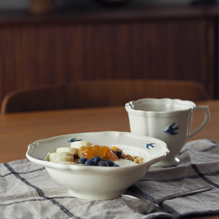 幅広のリムがまるで花のように見える170ボウル。リムの周りには朝の訪れを喜ぶように飛んでいるツバメが4羽描かれています。サイズ的には朝食のスープ、フルーツをたっぷりトッピングしたヨーグルト、シリアルやグラノーラなどにちょうど良く、ラウンドプレートLをアンダープレートとして使うとテーブルの雰囲気が高まります。