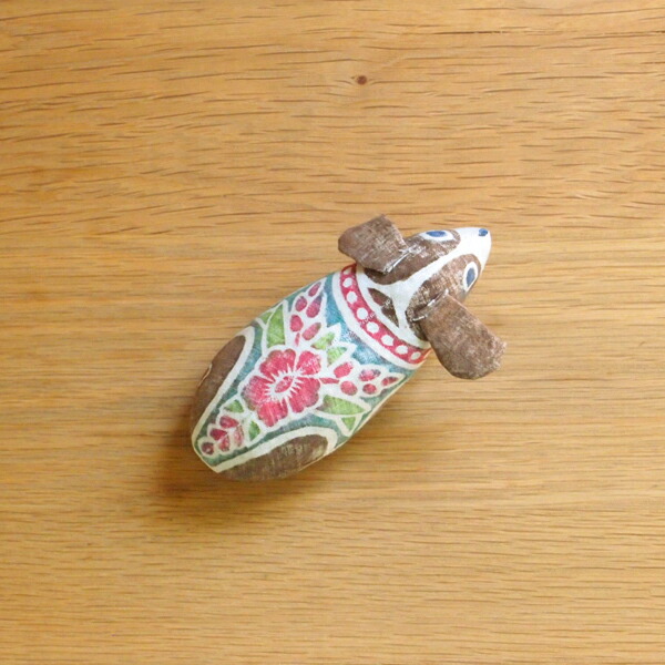 十二支シリーズは干支にちなんだ図案や飛騨に関連のあるモチーフが描かれているのが特徴。戌(いぬ)は赤い実をつける犬たでと赤い花のチャンチャンコを着ています。くりっとした瞳やむっちりとしたお尻、大きく垂れた耳に今にもフリフリしそうな尻尾と、どこから眺めても愛嬌たっぷり。単品で飾っても、親子で飾っても、優しい風合いは子どものおもちゃとしてもいいのではないでしょうか。
