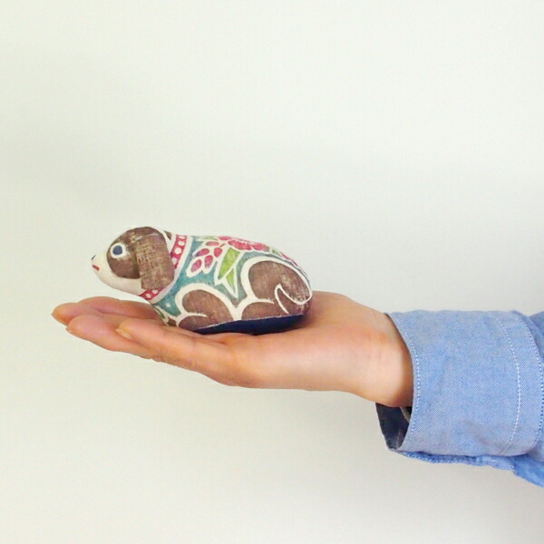 飛騨高山の工房で作られている、素朴な味わいが魅力の木版手染めぬいぐるみ。こちらは十二支シリーズの戌(いぬ)の親になります。