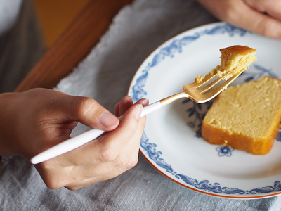 クチポールのペストリーフォークは3本刃が特徴です。悪魔のピッチフォークをそのまま小さくしたような形がわたしの胸キュンポイント。4本刃にはないかわいさがあるんですよね。ゴールドの色味も上品な艶消しゴールドなので普通のケーキもワンランクアップした気分になります。お菓子作りにハマっている娘がなんの記念日でもないのにケーキを作ってくれたので今日のおやつはこのフォークでいただきます。