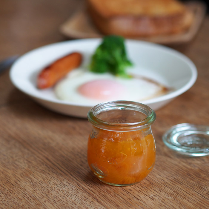 スタッフ千秋から「ちょっと酸っぱいけど」といただいた杏子を使って、あんず酒を作りました。出来上がったお酒を小分けにして飲んでもらおうと、「WECK モールドシェイプ 120ml」に詰めて持ってきました。まるでワンカップのような見た目が可愛く、ちょっとした贈り物やおすそ分けにもぴったりです。蓋は「WECK シリコンキャップ ブラック S」。しっかり閉まるので、汁漏れを気にせず安心して持ち運べます。小さなサイズ感が絶妙で、ガラス容器だから中身も見やすく、少量ずつ楽しみたいお酒やシロップの保存にもおすすめです。