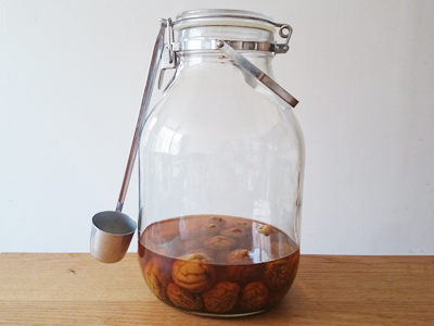 いつも梅シロップは4Lの瓶で漬け、砂糖が溶けたら梅の実を取り出してシロップはこの1Lの瓶に入れます。1Lの瓶は冷蔵庫に入るのでシロップの保存に最適です。梅仕事のものだけでなく、ピクルスを大量につける時にも使います。右側は7年ものの梅酒です。