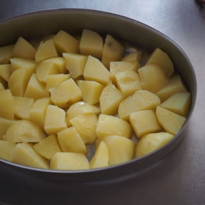 一口大に切ったジャガイモを耐熱容器に入れて電子レンジ600Wで約6分加熱する。串をさして中まで刺せればOK。オーブンディッシュに敷き詰める1 -