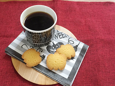 1人暮らしなので「家でのハロウィン」にあまり縁がなかったのですが、無印良品でかわいいかぼちゃクッキーを見つけたので今年はちょこっとハロウィンに挑戦。いつもはティーマやカステヘルミに載せるクッキーですが、モノトーンのマリメッコ+木のプレート+ペーパーナプキン+赤いランチョンマットでハロウィン風おやつプレートに。ぐっと雰囲気が出てきた気がします~♪