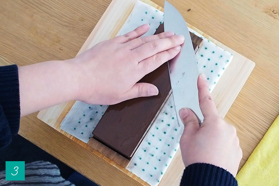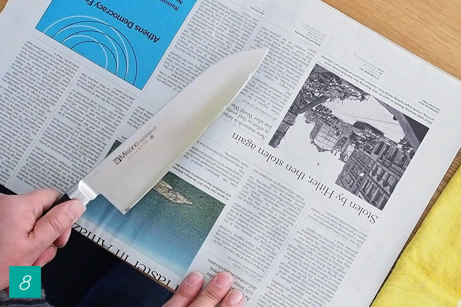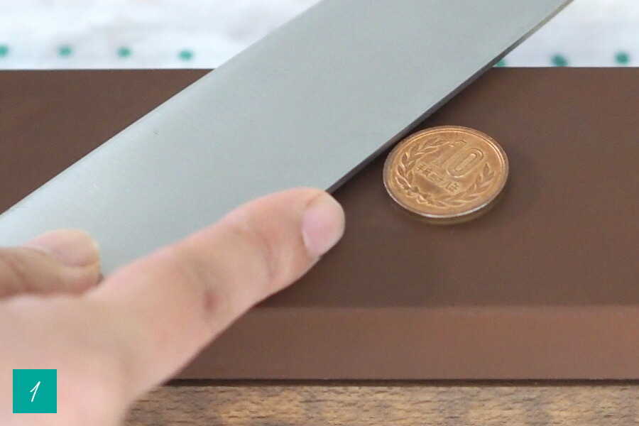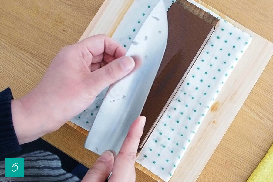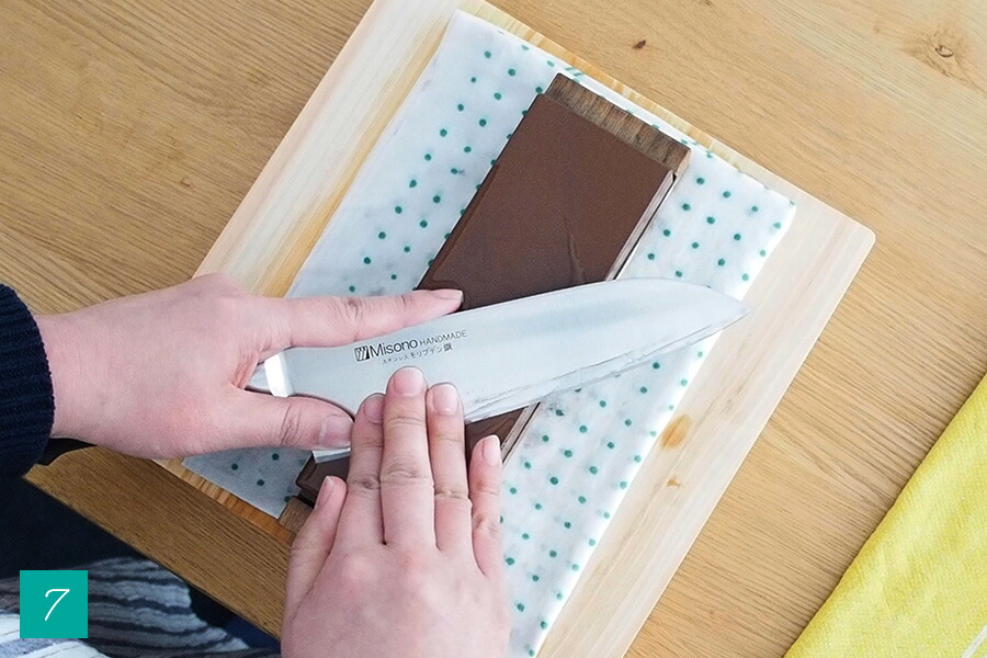 カエリは包丁と砥石が擦れ合って包丁の刃先がめくれあがってきた部分です。指の腹で触ったときに、ざらっと感じたらカエリがついている証拠です。包丁の刃の全体にカエリがつくまで研いでください。ザラつきを感じない部分は、もう一度研いでください。全体にカエリがついたら次の工程に進みます。